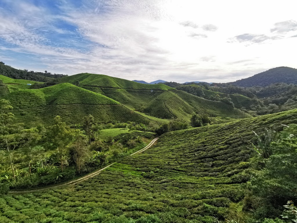 Il ne pleut pas…. Pas une goutte… Le ciel est même dégagé… Je ne comprends pas, c’est pas du tout le même Cameron Highlands qu’en 2015… Départ ce matin avec un guide, pris via l’auberge. On est 8 dans la jeep au confort sommaire, 4 français, 3 espagnols et une hollandaise. Pas encore (trop) de bouchons, il est 8h, on part vers une plantation de thé, la BOH plantation, BOH signifiant best of highland. C’est un peu l’attraction du coin puisqu’une des plus grandes exploitations, encore tenue par des écossais. C’est aussi du coup de cette plantation qu’on peut faire les meilleures photos, sans 50000 immeubles ou magasins à touristes à proximité. Les ouvriers travaillent déjà, ici on taille à la main en évitant de se faire mordre par les serpents ou les bestioles que je n’aime pas. Govin notre guide nous raconte tout plein d’anecdotes sur le thé et sur les dangers de la jungle, photos de tigres à l’appui. Ici le thé est noir. Paraît que même si c’est la même plante, c’est la fermentation qui fait la couleur du thé : noir, blanc ou vert. Quelques photos avant la dégustation de rigueur, mais pas de visite de l’usine, dommage c’est fermé pour maintenance. L’endroit est vite envahi de touristes, il est temps de se balader un peu dans les champs de thé.